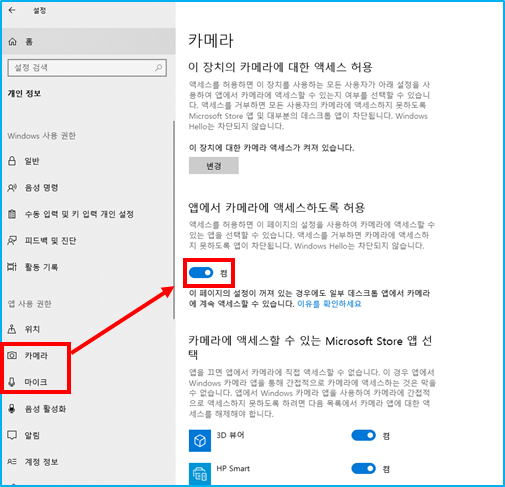 2. 카메라, 마이크 > 앱에서 엑세스 하도록 허용 > " 켬 "