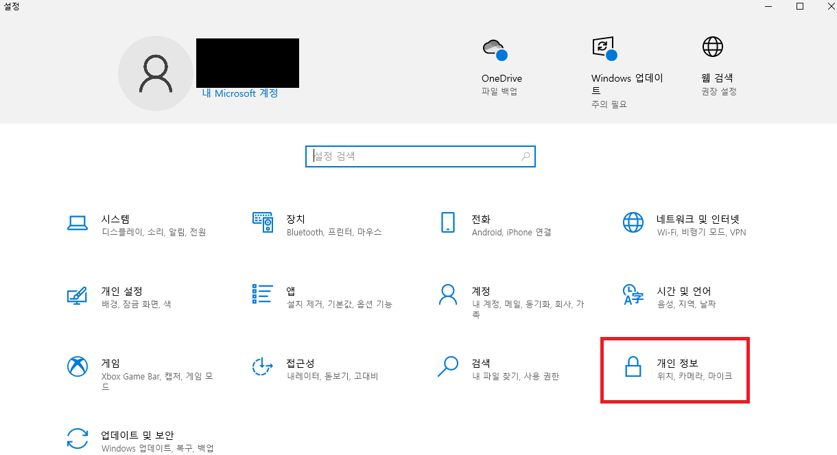 1. 윈도우 키 또는 검색창에 "설정" > 개인 정보