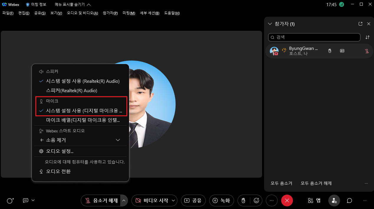 먼저 Webex에서 마이크 연결 상태를 확인하여 주세요!