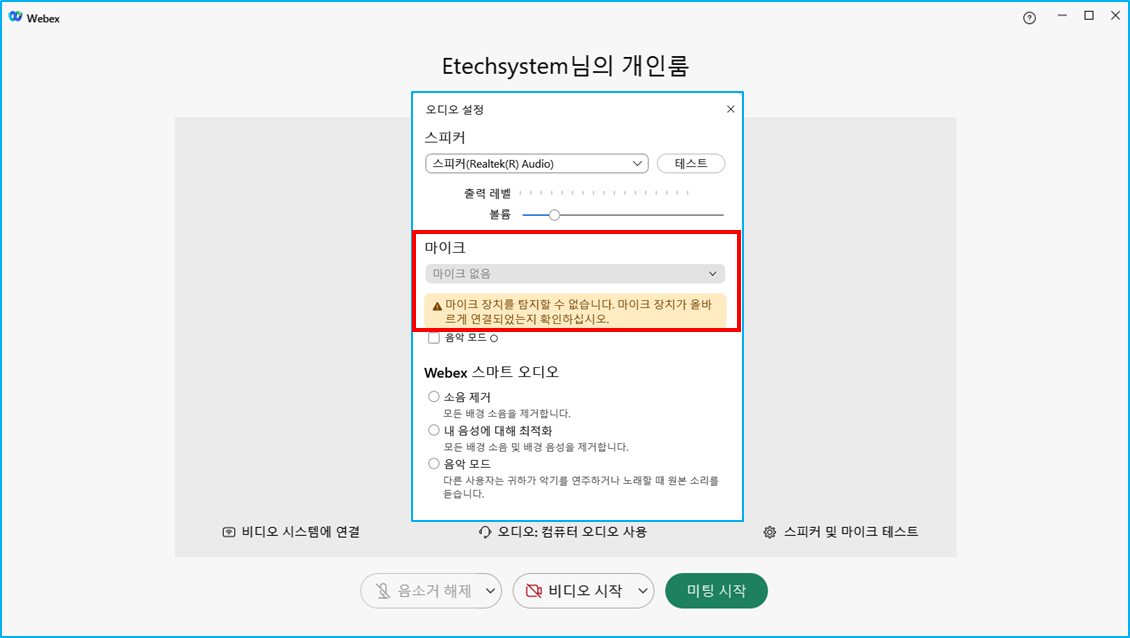 2. 웹엑스 프로그램이 마이크를 인식하지 못하는 경우
