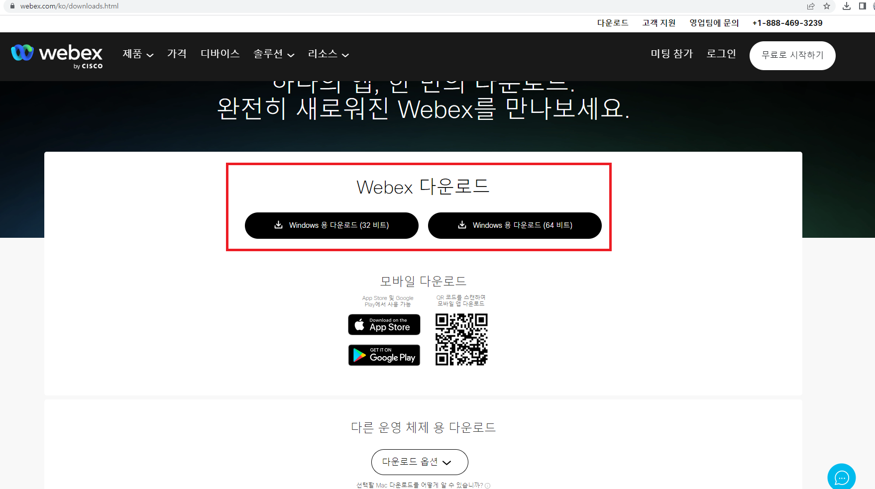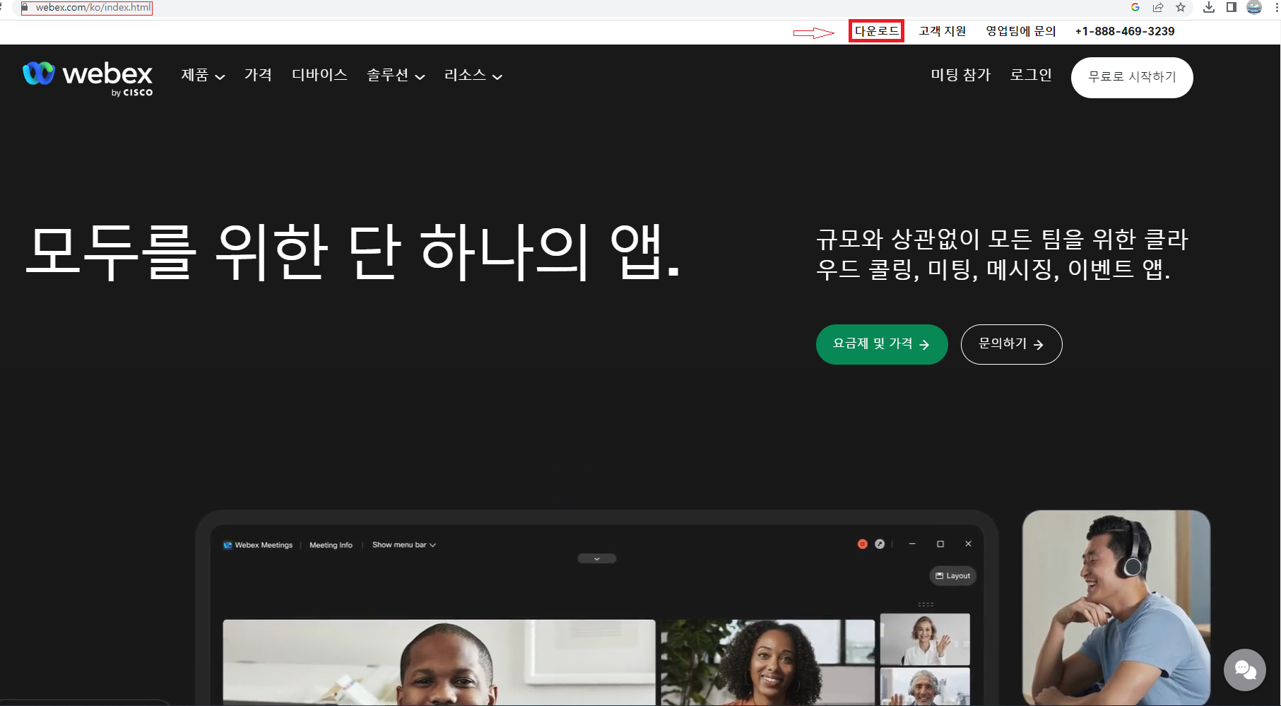 또는 https://www.webex.com/ko/index.html 옆에 링크를 접속하여 주세요.