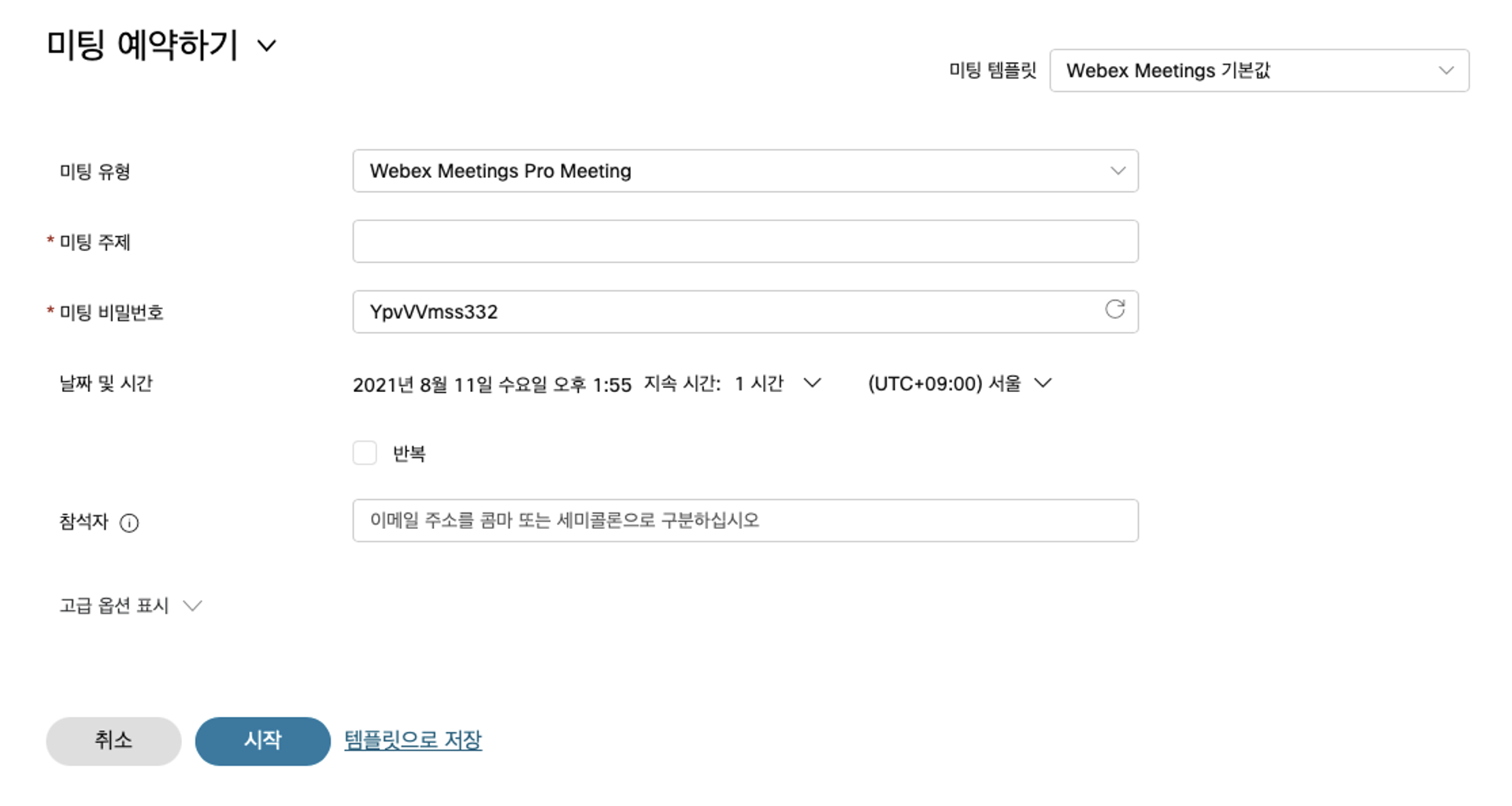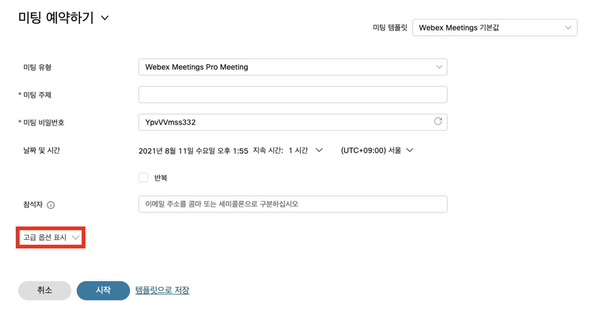 고급 옵션 표시를 클릭하여 사용자가 미팅으로 전화하고, 의제를 추가하는 방법 등을 사용자 정의할 수 있습니다.