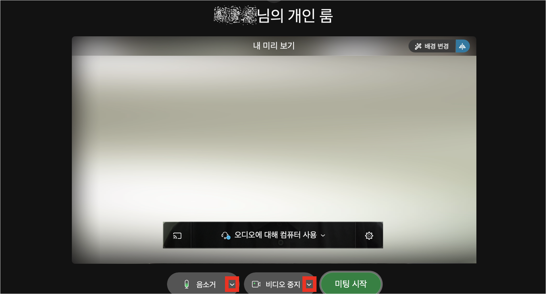스피커 및 마이크, 비디오 설정 완료했다면, 미팅 시작을 클릭하여 미팅 시작하면 됩니다.