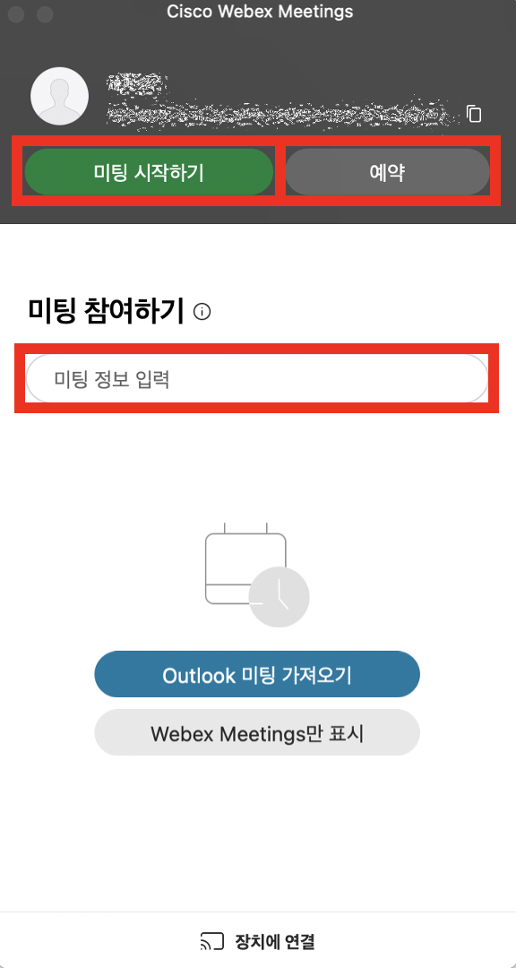 Webex Meetings에서 미팅 시작, 예약, 미팅 참여를 할 수 있습니다.