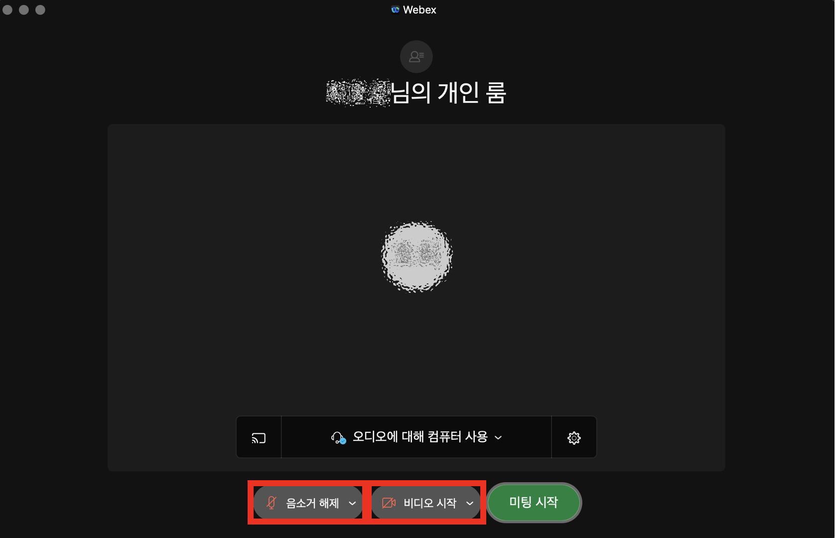 음소거 해제, 비디오 시작 클릭하면 마이크와 비디오 활성화